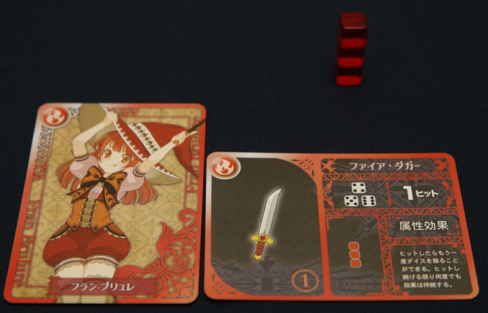 そして肝心な我々の武器の準備をしなくてはいけません。各自自分の属性の武器カードを見てレベル関係なく好きなものを1枚取って、キャラクターカードの隣に伏せてください