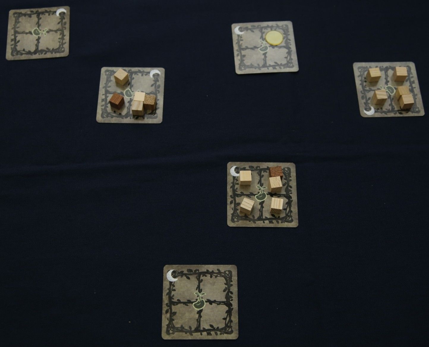 木製のブロックも各自5個ずつ配ります。その手元に置いた裏のカードに好きなように配置してください
